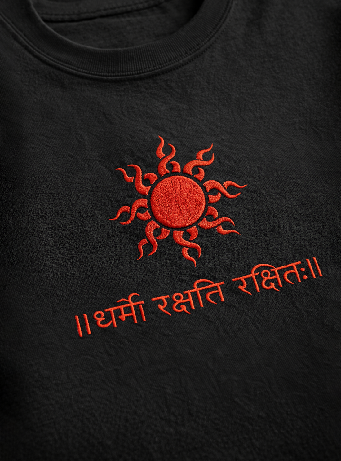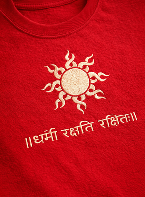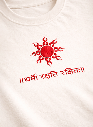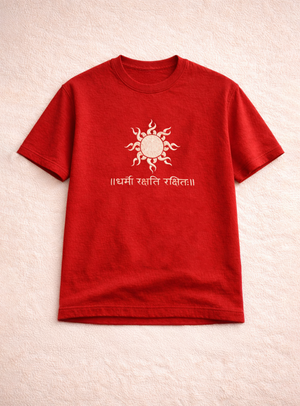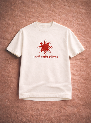 The Dharmo Rakshati Rakshitah Tee represents an ancient principle of righteousness and protection. The Sanskrit phrase means “Dharma protects those who protect it.”