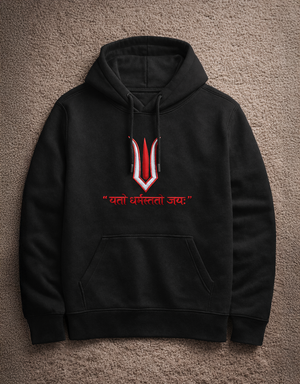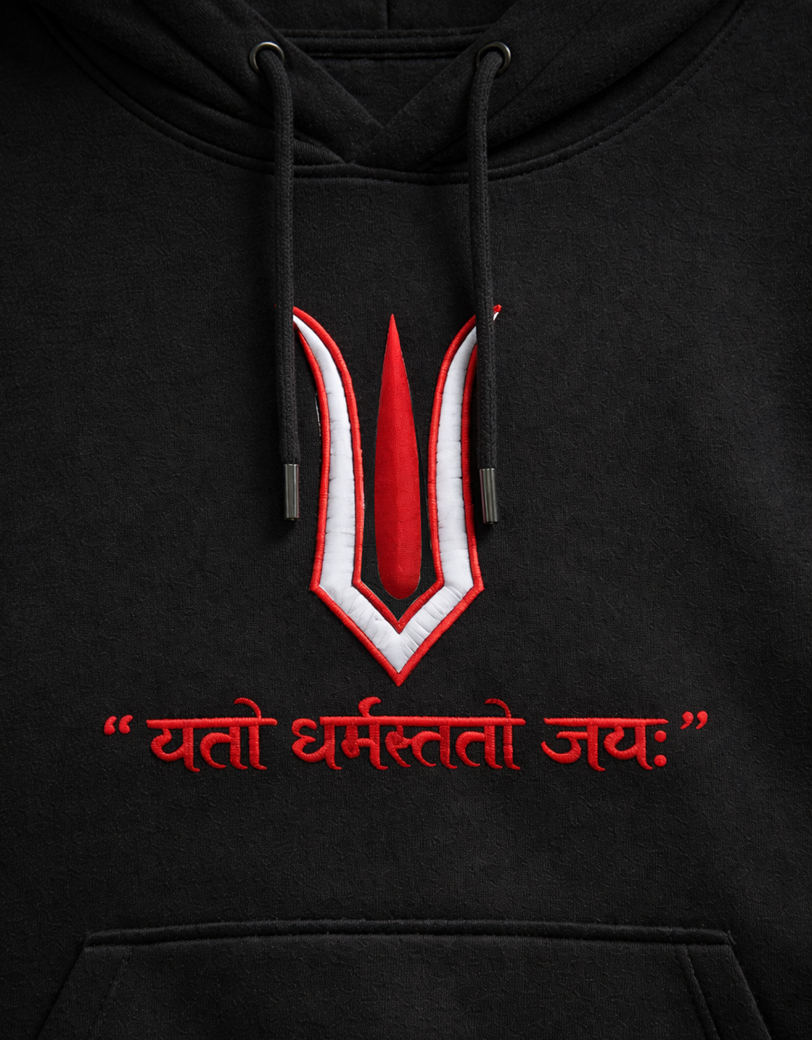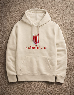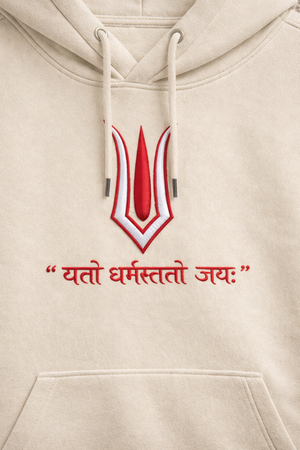 The sacred tilak, finely embroidered at the chest, symbolizes unwavering faith, discipline, and inner strength. Below it, the Sanskrit verse “यतो धर्मस्ततो जयः”—Where there is Dharma, there is Victory—stands as a quiet yet powerful reminder to live with purpose.