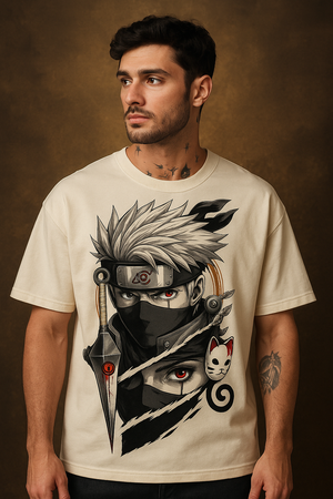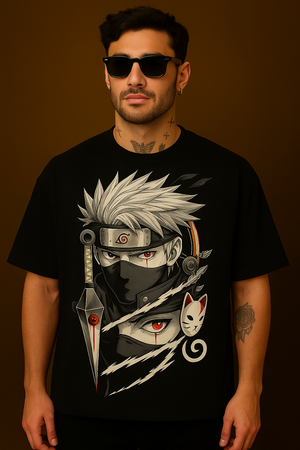 Step into the world of shinobi with our Naruto-inspired oversized t-shirt, crafted from premium 240 GSM French Terry cotton for unmatched comfort and durability. Featuring a bold, high-definition Kakashi Hatake artwork with striking kunai, Sharingan eye, and ANBU mask details, this tee is a must-have for anime enthusiasts. Designed for a relaxed streetwear fit, it combines Japanese anime aesthetics with modern oversized fashion.