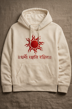 Crafted in premium fleece, this hoodie features a striking red Surya symbol paired with the timeless Sanskrit mantra “धर्मो रक्षिति रक्षितः” meaning “Those who protect Dharma are protected by it.”