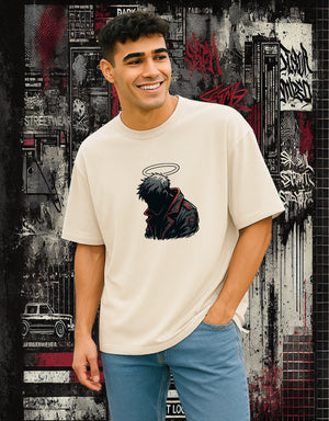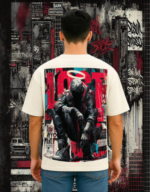 Where street meets soul – the Street Angel White Oversized T-Shirt is a bold expression of modern chaos and quiet resilience. Featuring a powerful back graphic of a hooded figure with a glowing halo seated against graffiti-covered walls and the word "LOST" screaming in raw texture, this tee embodies the duality of darkness and light.