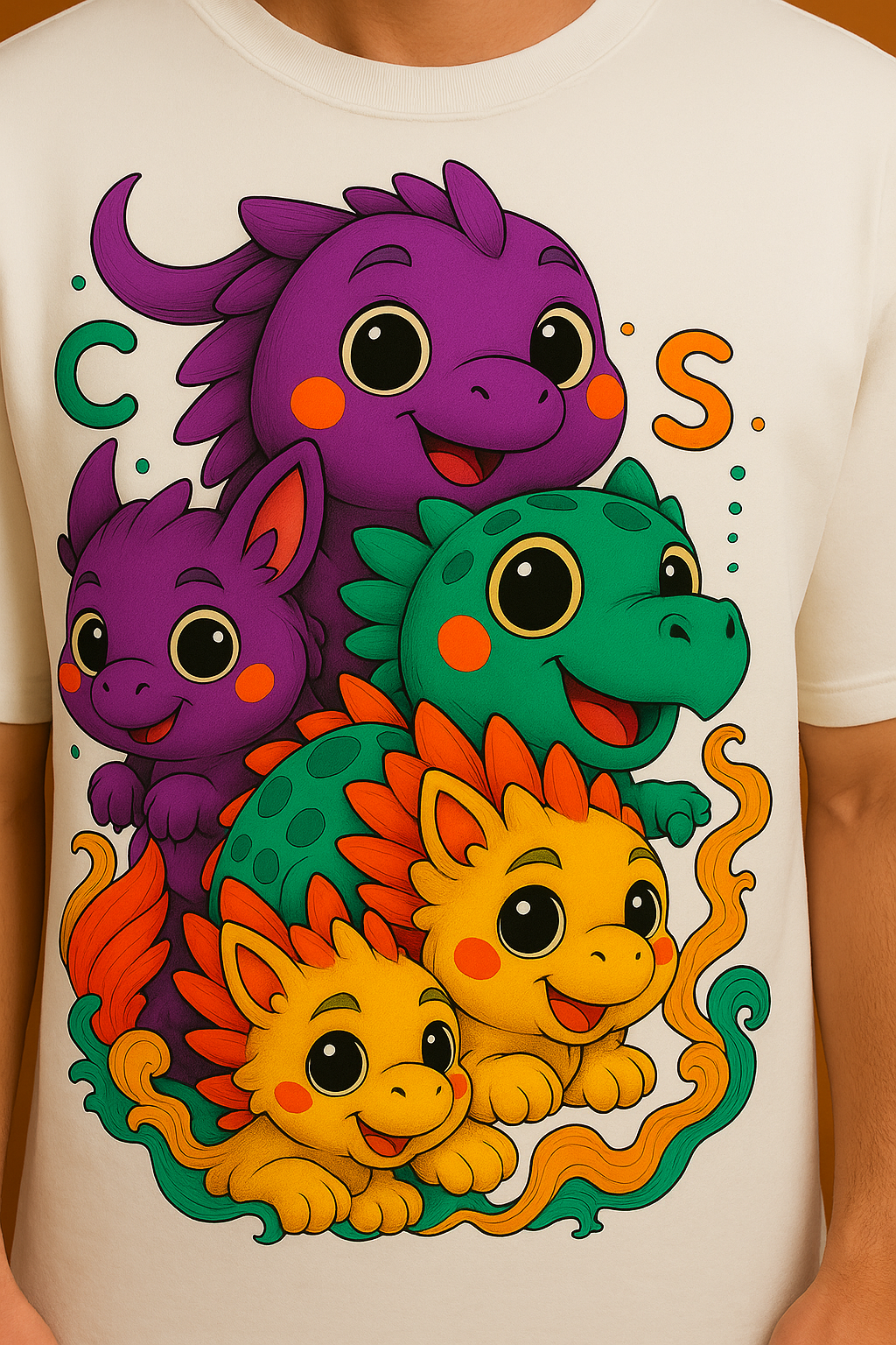 Unleash the magic of imagination with the Tiny Titans Tee – where adorable baby dragons meet bold streetwear style. Designed with vibrant colors and playful details, this tee captures the charm of fantasy creatures in a fun, eye-catching way. Made with 240 GSM 100% cotton terry, it offers premium comfort, durability, and a perfect oversized fit for everyday wear.