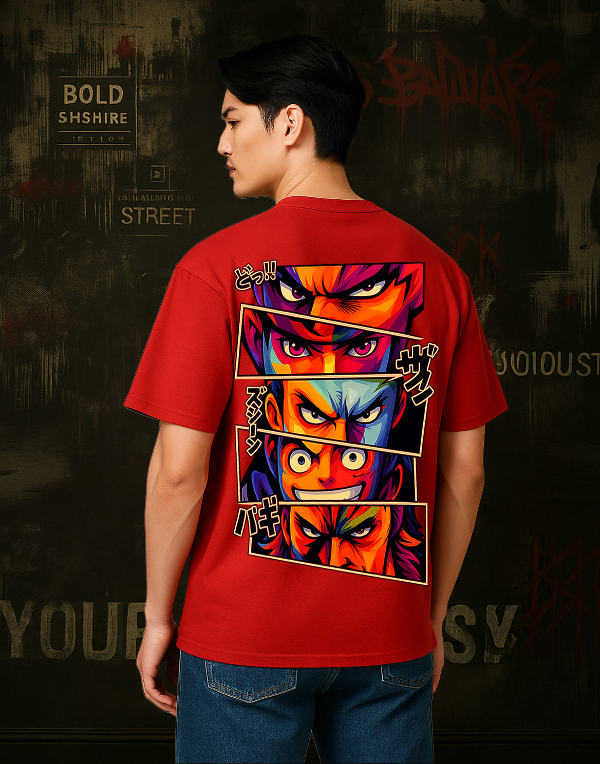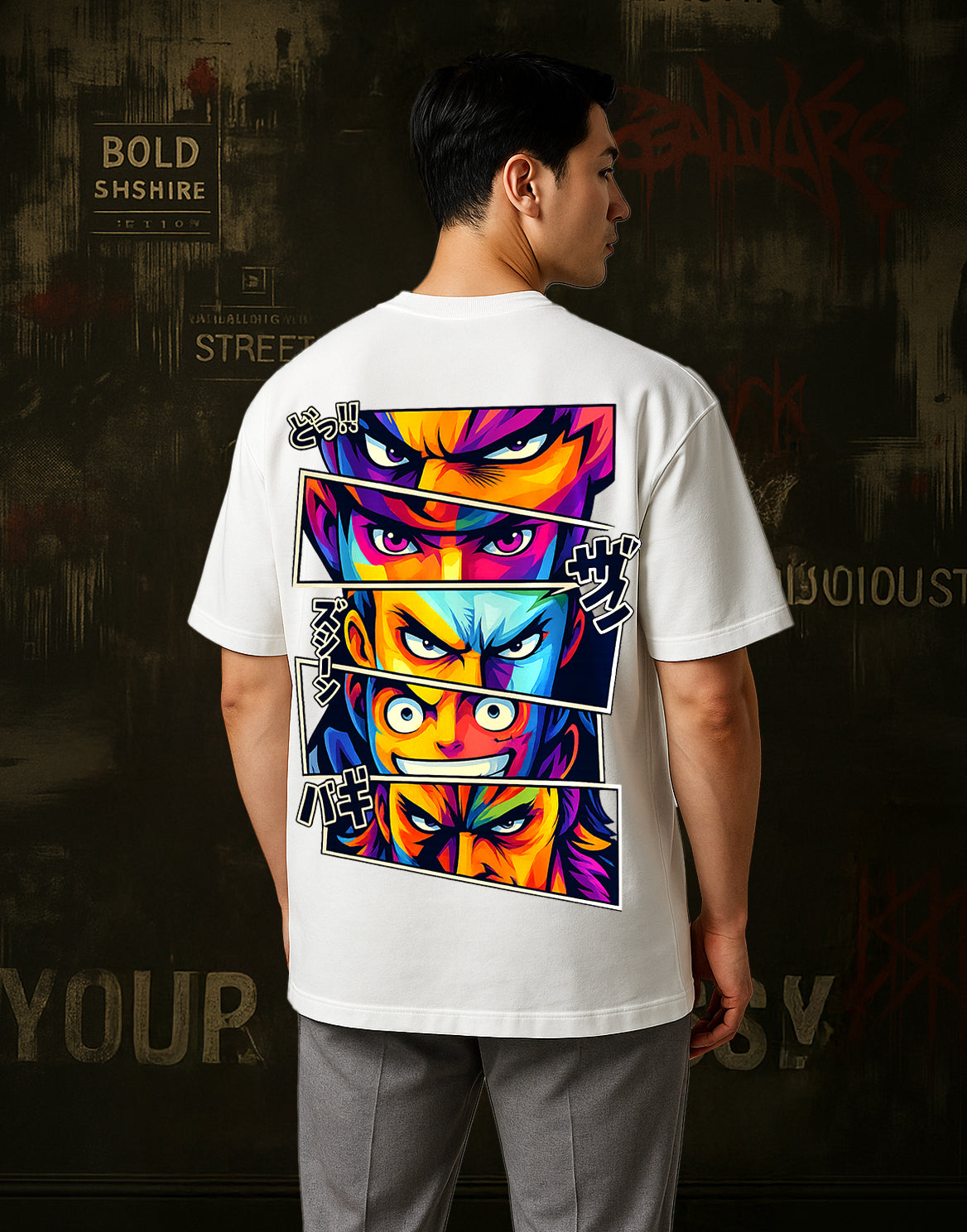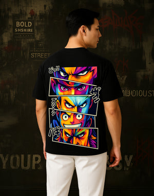 Unleash your inner warrior spirit with the Face Design Oversized Drop Shoulder T-Shirt from Shadow X — a bold fusion of anime-inspired artistry and premium streetwear craftsmanship. This design features a striking multi-panel face graphic in vivid, high-definition colors, making it an instant attention-grabber on the streets.